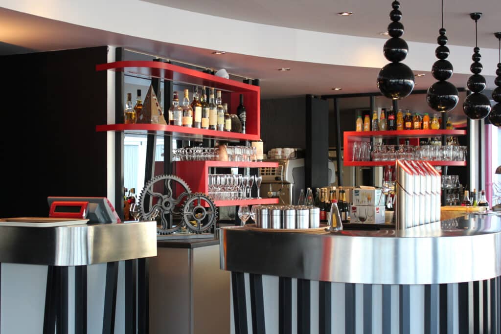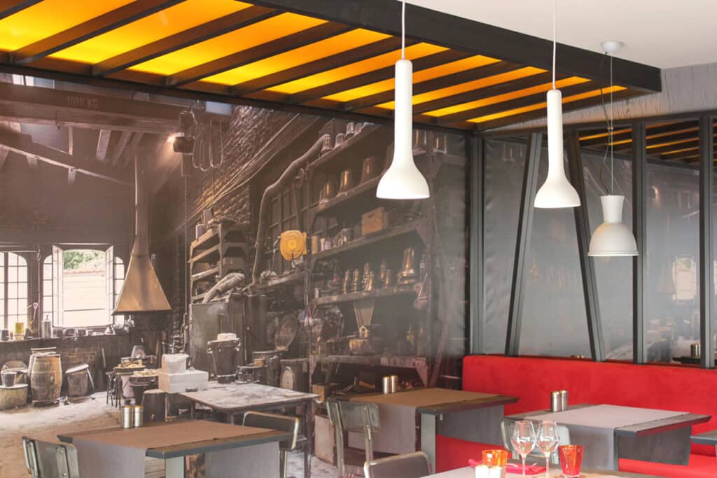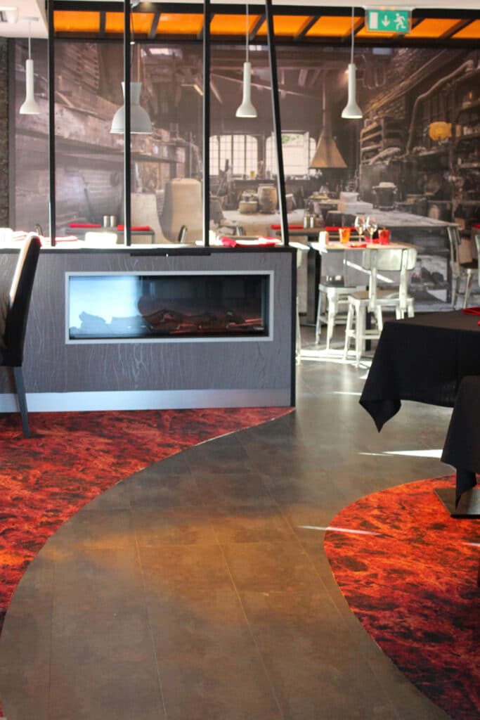 C’est donc sur ce thème que nous avons proposé notre concept intérieur, l’idée étant de donner aux clients l’impression de passer un agréable moment dans une fonderie. Nous avons joué avec les matières, les couleurs, placé une photo à très grande échelle, une cheminée, des verrières… pour créer, en symbiose, ce concept décoratif.